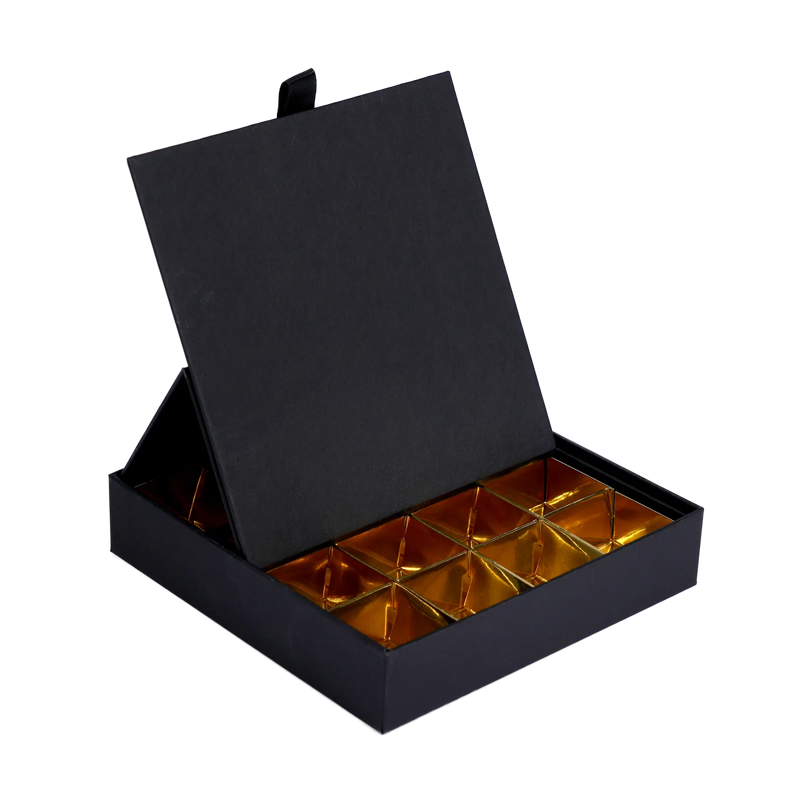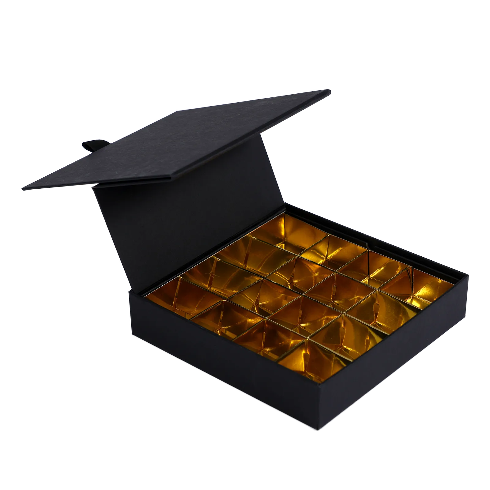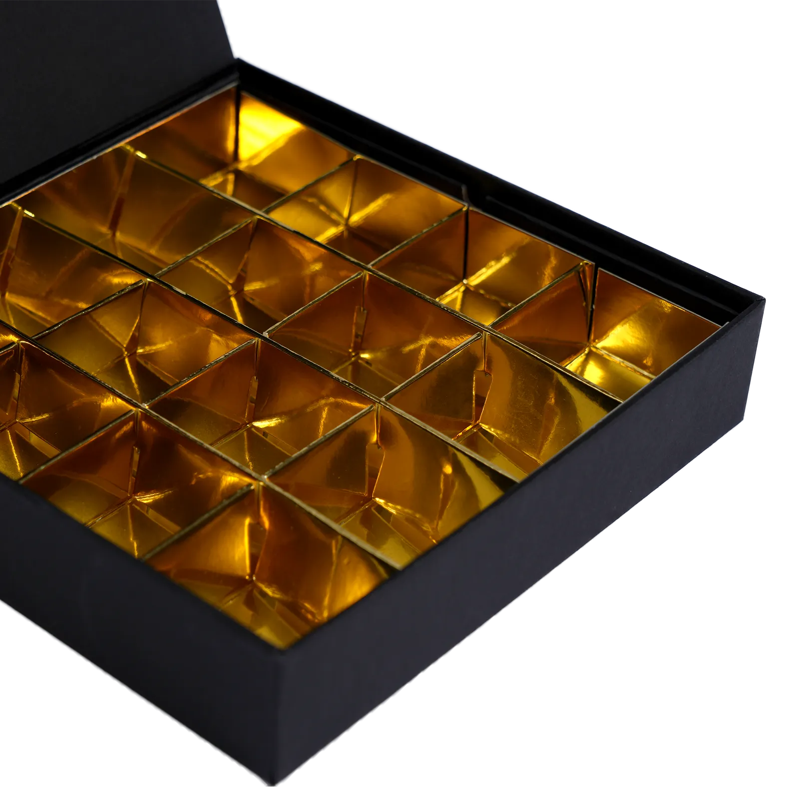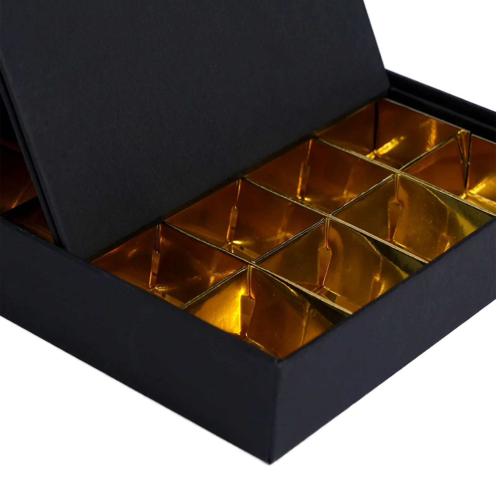 Deze luxe bonbon doosjes in mat zwart met een goudkleurig interieur geven elke praline, truffel of fudge meteen een premium uitstraling, van cadeaumoment tot high-end retail. De stevige kartonnen constructie beschermt je chocolade, terwijl het reflecterende gouden binnenwerk de kleuren en glans van je bonbons versterkt.