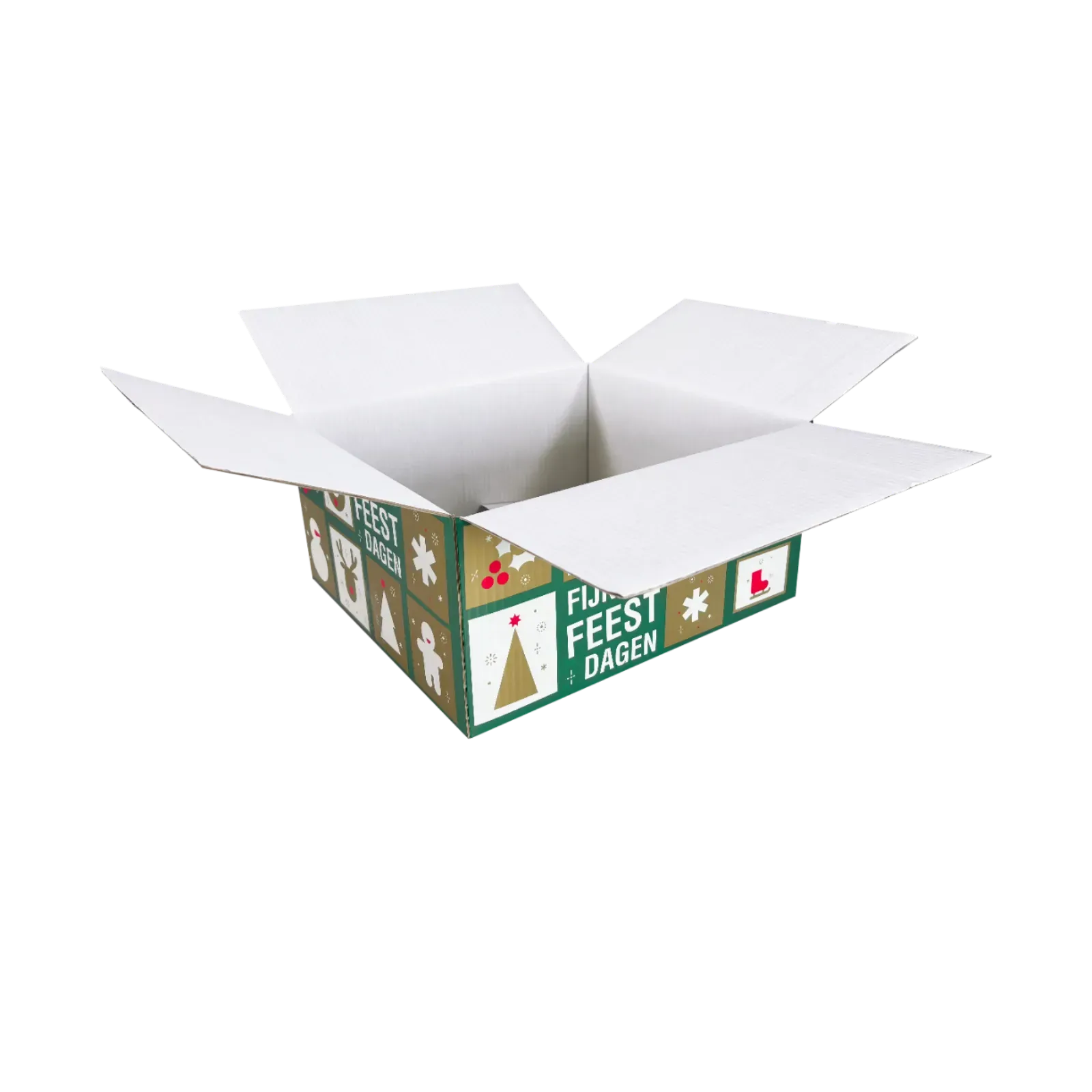 De Kerstpakketdoos Celebration is ontworpen om direct feestvreugde uit te stralen. De kleurrijke prints met kerstsymbolen zoals rendieren, sneeuwvlokken en cadeautjes zorgen voor een unieke uitstraling. Voor bedrijven betekent dit: geen extra kosten of tijd kwijt aan cadeaupapier, want je verzending ziet er meteen feestelijk en professioneel uit.