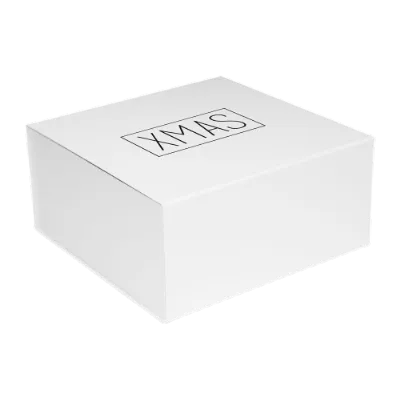 Exclusieve luxe witte magneetdoos speciaal voor kerstgeschenken. Deze witte magneetdozen zijn aan de bovenkant (klep) voorzien van de bedrukking ‘XMAS’. Deze magneetdozen zijn gemaakt van sterk gerecycled karton en omplakt met papier. De klep is hersluitbaar door middel van magneetjes in de klep.